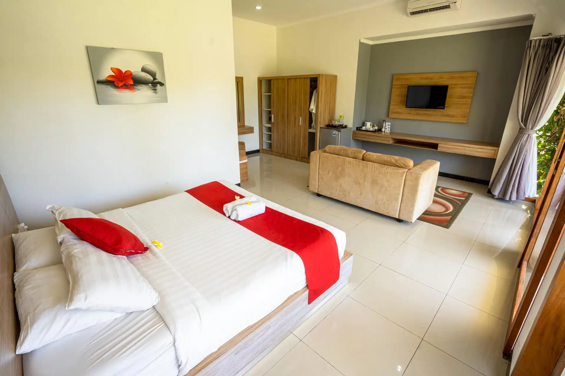 READ MOREThese spacious air-conditioned rooms of 30 square meters come with one large comfortable bed and a beautiful open-air bathroom with a small garden, shower, and a hot tub.