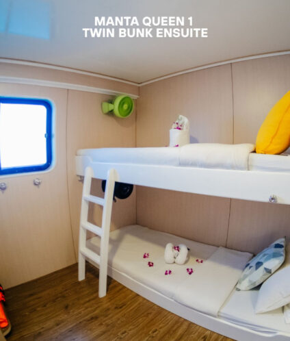 Twin bunk bed cabin located on the main deck of Manta Queen I. Suitable for two guests and equipped with air conditioning and private bathroom.