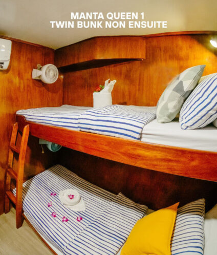 Twin bunk bed non-ensuite cabin located on the main deck of Manta Queen I. Suitable for two guests, this cabin features comfortable bunk beds, air conditioning, and easy access to shared bathroom facilities. Ideal for divers looking for a practical and comfortable accommodation option.